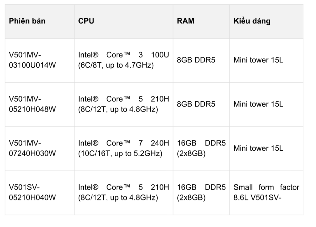 Dòng ASUS V501 tại Việt Nam gồm 4 cấu hình chính, khác nhau theo CPU, RAM và kiểu dáng thùng máy (mini tower 15L hoặc small form factor 8.6L) trải dài nhiều phân khúc nhu cầu và ngân sách.